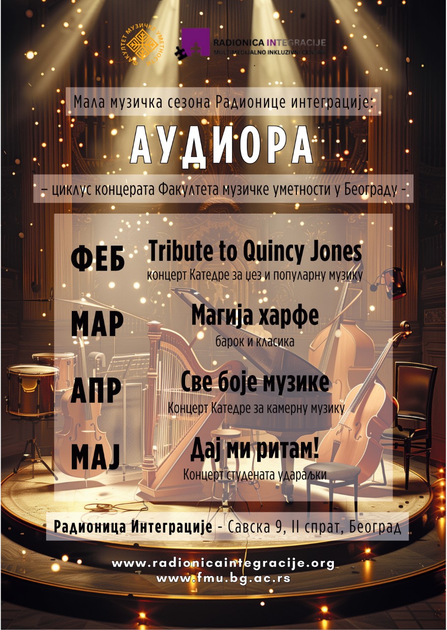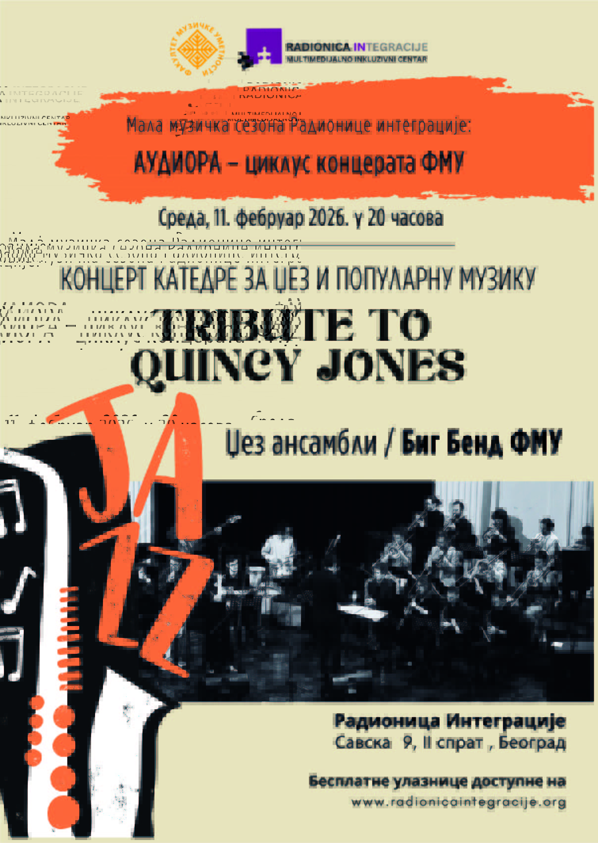 Ciklus AUDIORA svečano počinje 11. februara 2026. godine u 20 časova u umetničkom prostoru Radionica Integracije (Beograd, Savska 9, II sprat) koncertom studenata Katedre za džez i popularnu muziku – Tribute to Quincy Jones. Pored Big Benda FMU nastupaju i manji džez ansambli (osnovne i master akademske studije). Na sceni će se naći preko 40 mladih džez muzičara uz umetničko vođstvo njihovih mentora, afirmisanih profesora i etabliranih domaćih džez umetnika. Koncert će publika moći da prati i uživo preko Youtube stranice Radionice Integracije!