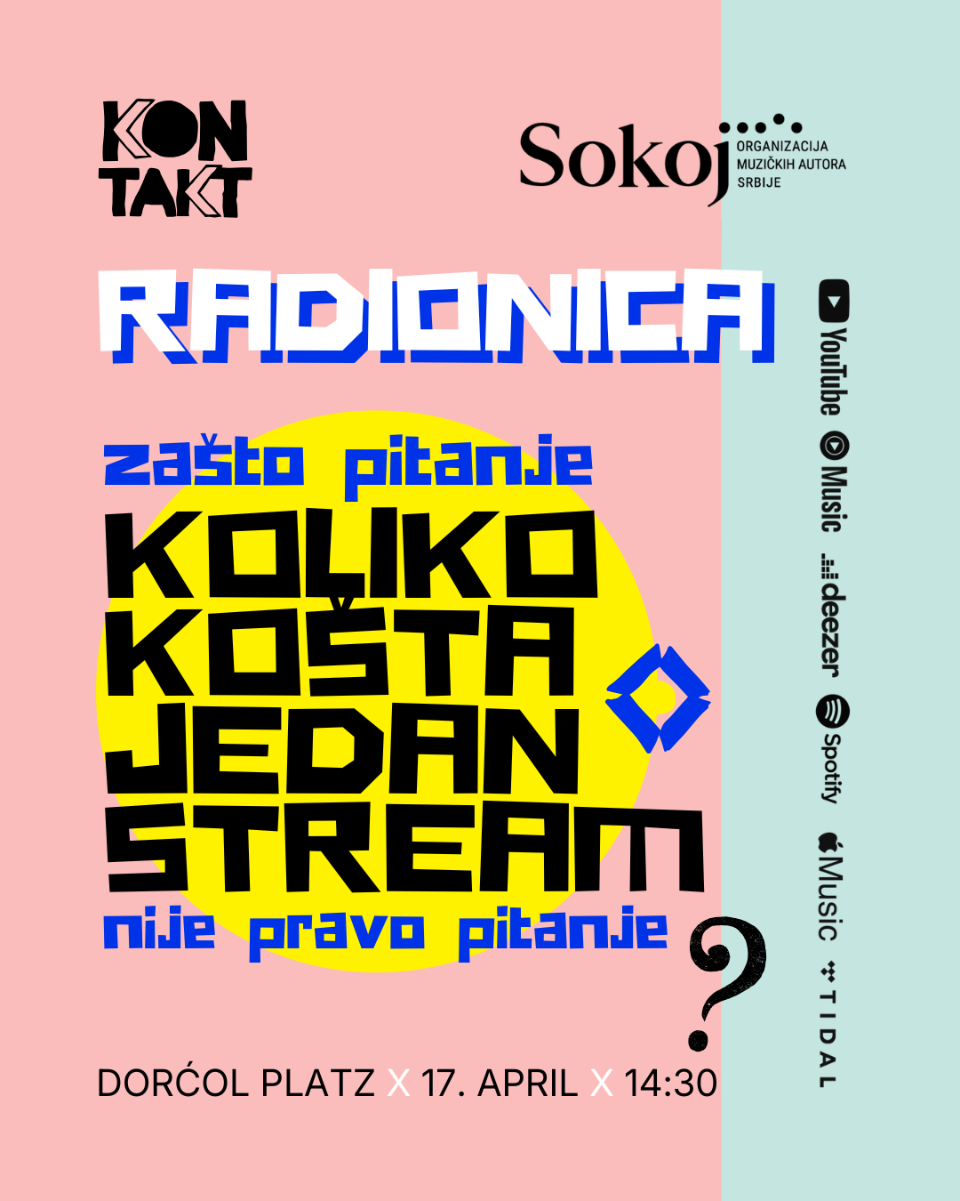U okviru Kontakt konferencije, u saradnji sa Organizacijom muzičkih autora Srbije – Sokoj, 17. aprila 2026. godine u 14.30 časova na Dorćol Platzu biće održana besplatna radionica posvećena autorskom pravu na digitalnim platformama pod nazivom “Zašto pitanje ‘Koliko košta jedan stream?’ zapravo nije pravo pitanje”.