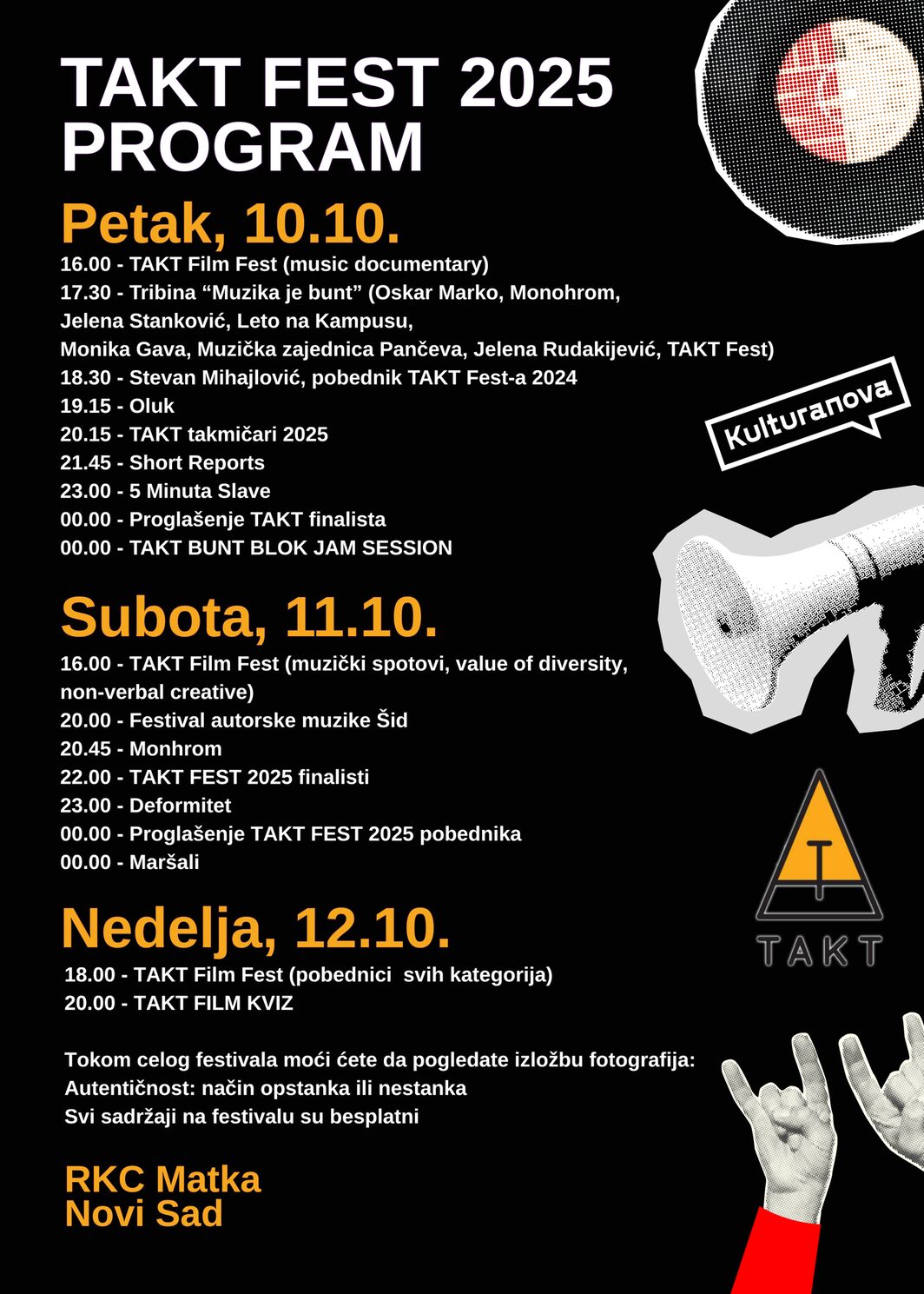 – Osim toga, u revijalnom delu ove godine TAKT će ugostiti bendove 5 Minuta Slave, Maršali, Short Reports i mnoge druge. Na tribini “Muzika je bunt” razgovaraćemo o društvenoj situaciji, kulturi i ulozi muzike u građanskoj neposlušnosti i aktivizmu. Festival će pratiti i izložba “Autentičnost: način opstanka ili nestanka”, na kojoj će se takođe naći i fotografije sa protesta – kažu organizatori i dodaju: