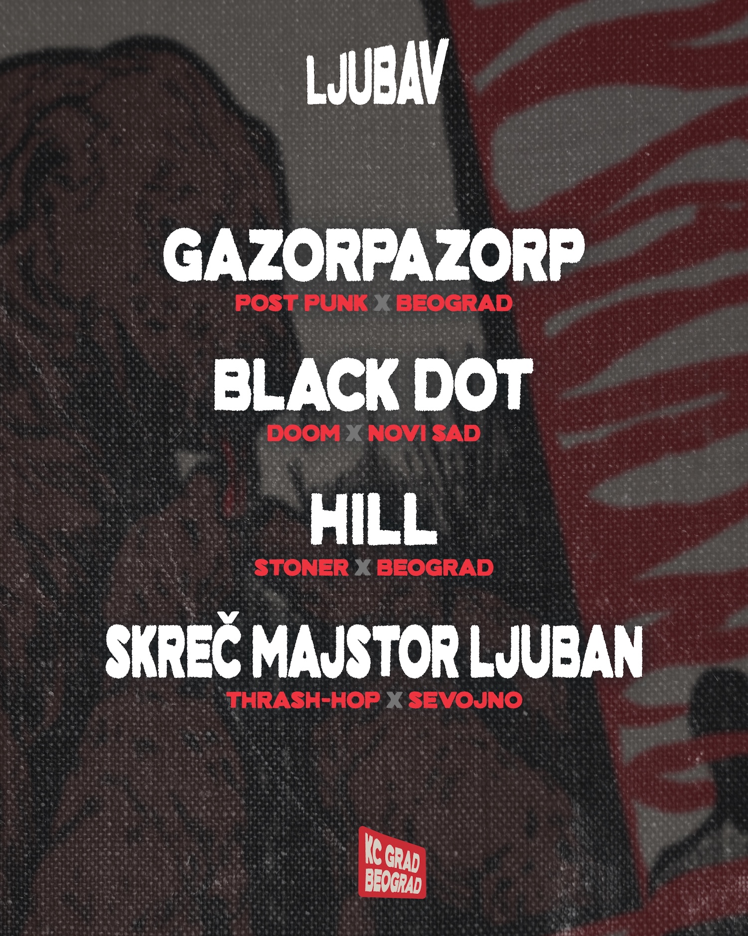 Gazorpazorp je svima sada već dobro poznati beogradski post-pank, rokenrol bend sa kojim LiB sarađuje na različitim frontovima godinama unazad. Sviraju skladno, ne kriju emociju, znaju i da popizde, definitivno se može reći da se kroz njihov mjuz provlače i ljubav i bes.