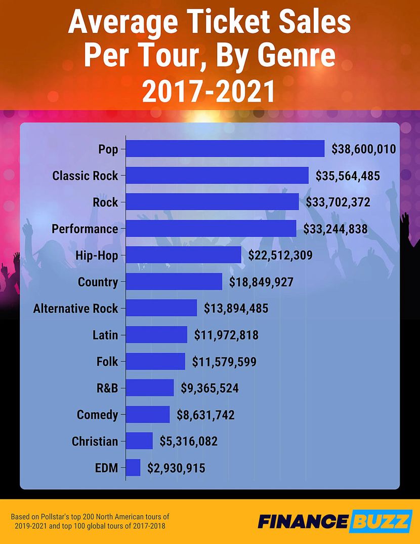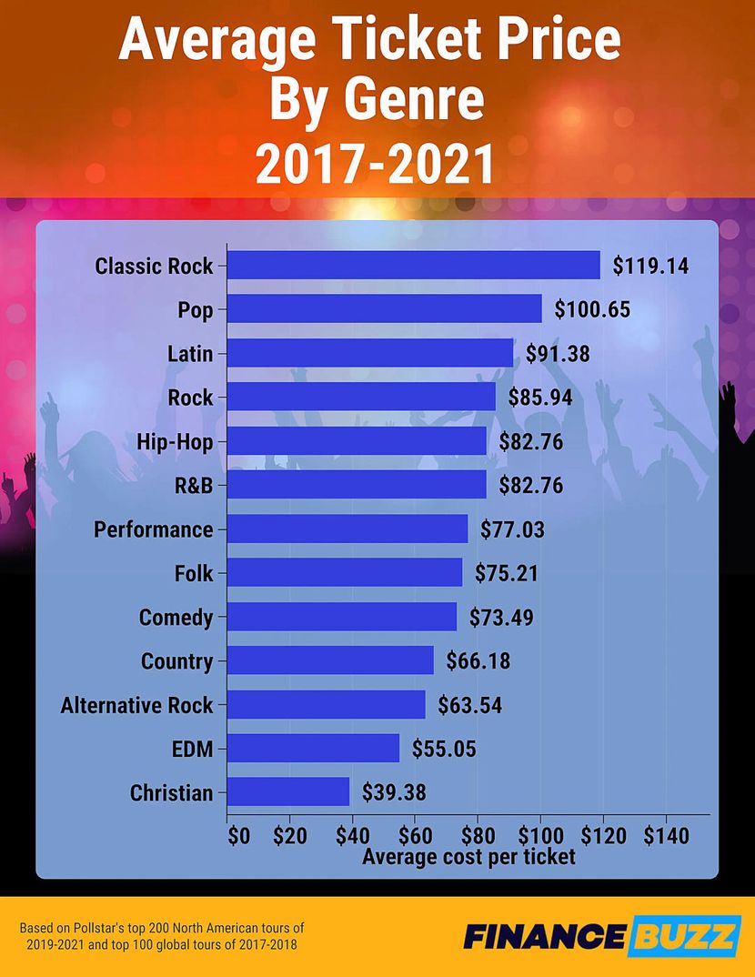 Studija je sakupila podatke o koncertnoj industriji za 800 najboljih nastupa na turnejama od 2017. do 2021. U tom vremenskom okviru, prosečna cena ulaznice za izvođača klasičnog roka bila je 119,14 dolara. Poređenja radi, sledeća najviša cena bila je skoro 20 dolara niža, za pop koncerte, u proseku 100,65 dolara po ulaznici.