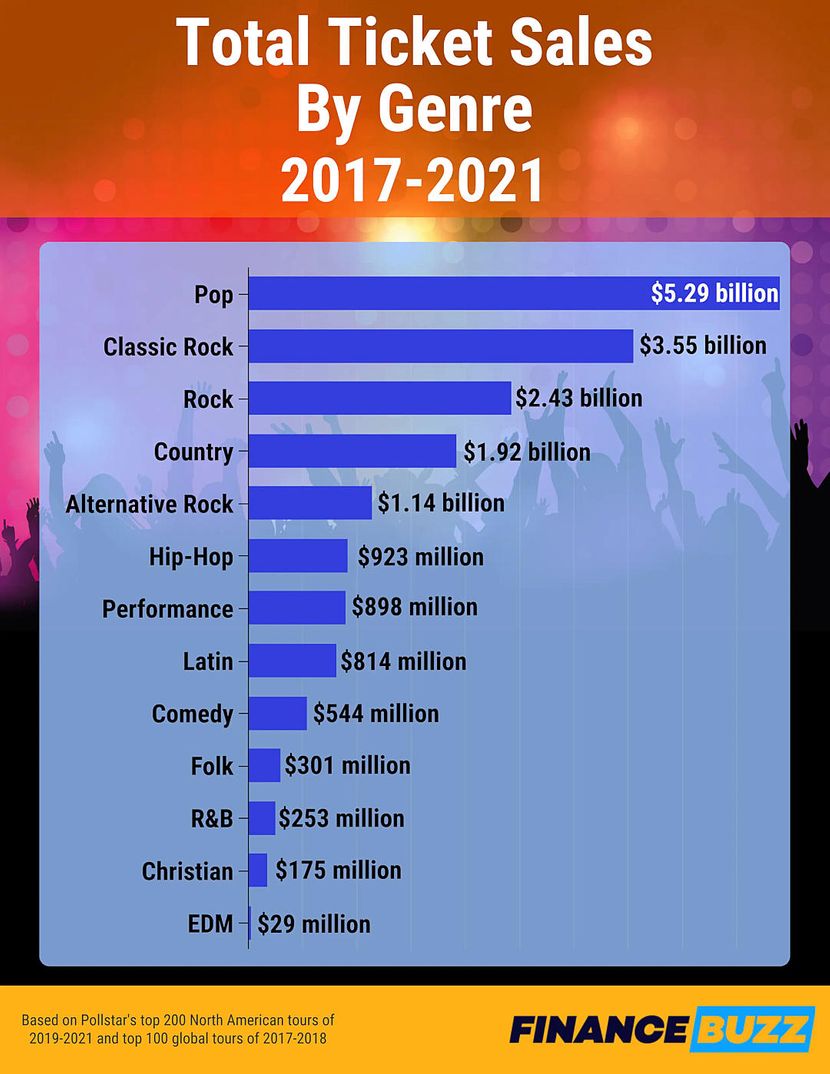 Iako ovi brojevi mogu biti zastrašujući za fanove, oni su nesumnjivo “muzika za uši” klasičnih rokera. Ovaj žanr je ostvario više od 3,5 milijardi dolara u prodaji karata u proteklih pet godina, rangirajući se malo iza pop umetnika, koji su doneli 5,2 milijarde dolara.