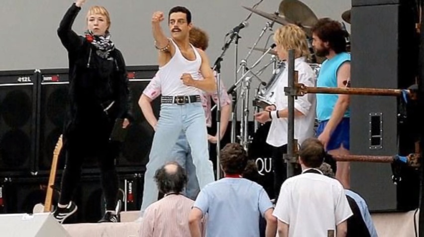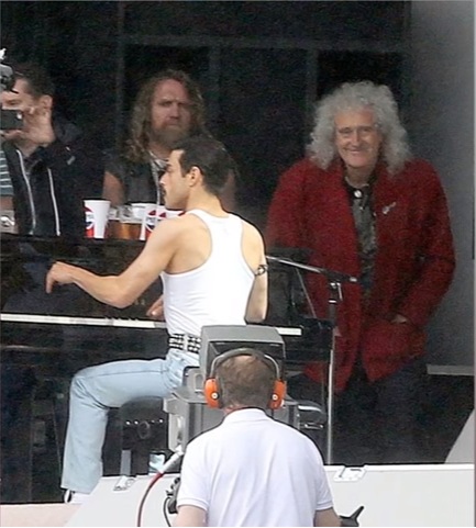 Na snimku, Malek ulazi na scenu, baš kao Merkjuri na Vembliju 1985. uz ovacije publike dok seda za klavir i počinje da svira ” Bohemian Rhapsody”.